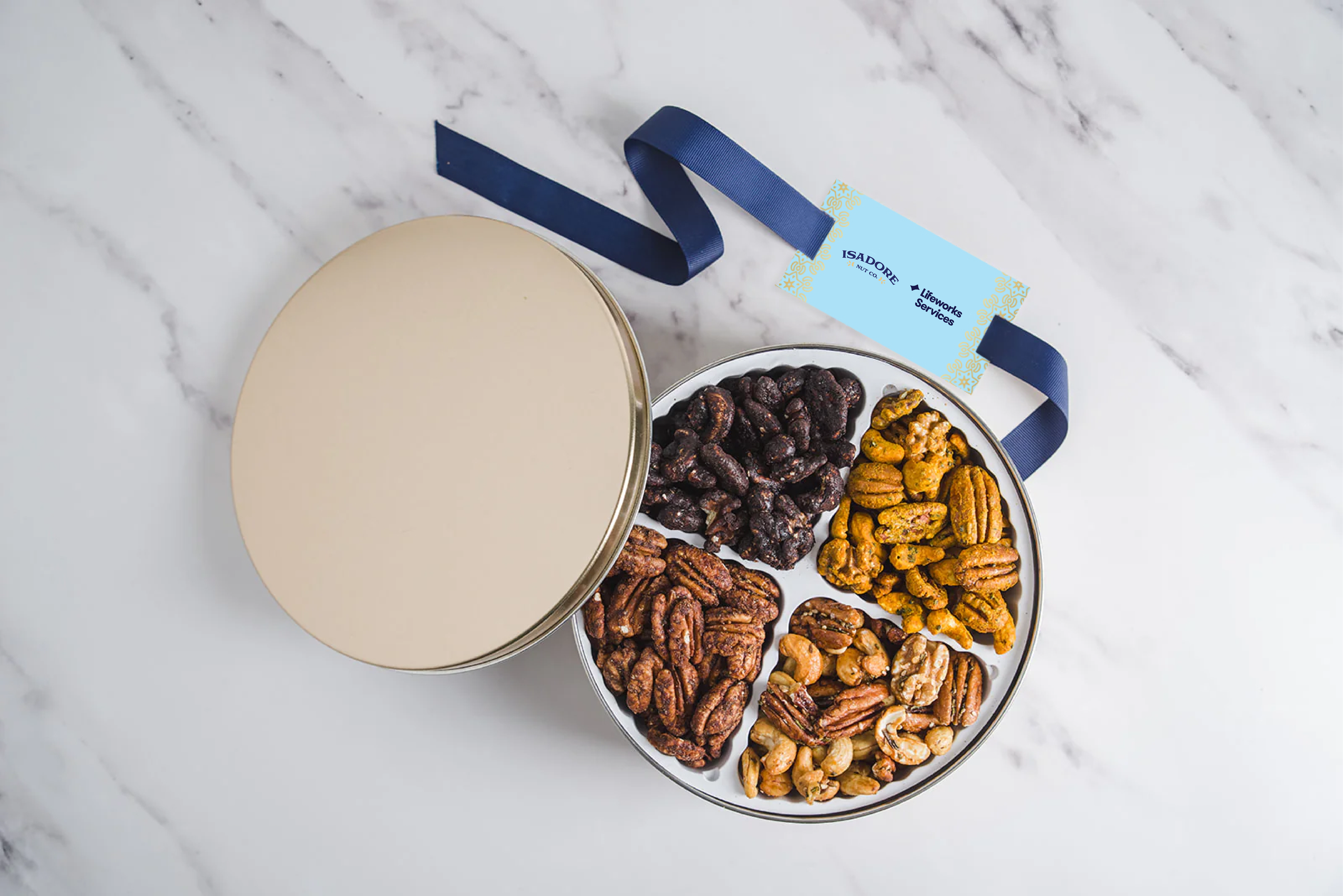 A curated selection of four of our best-selling nut blends makes the perfect gesture. Each keepsake gold tin is elegantly wrapped with a navy ribbon securing a Lifeworks & Isadore Nut Co. gift tag and is filled with a quarter pound each of our most loved flavors: