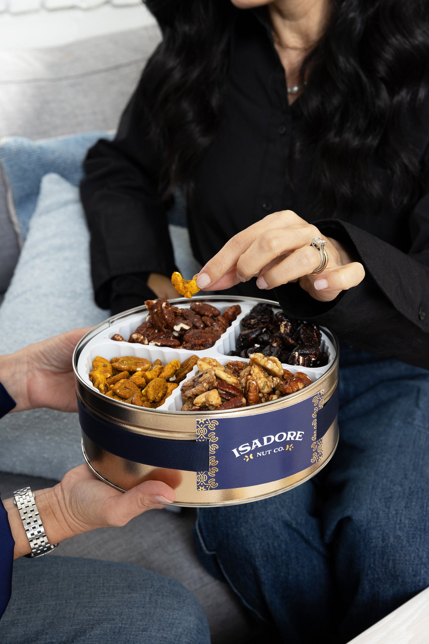 Our keepsake gold tin is elegantly wrapped with a navy ribbon securing our signature Isadore Nut Co. card.