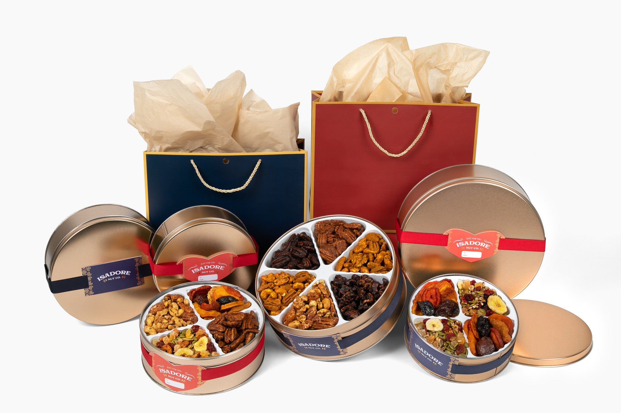 A crave-worthy collection of award-winning nut mixes, gourmet dried fruits, and nut-free artisanal blend, in an elegant keepsake gold tin thoughtfully wrapped with our signature grosgrain ribbon and gift tag.
