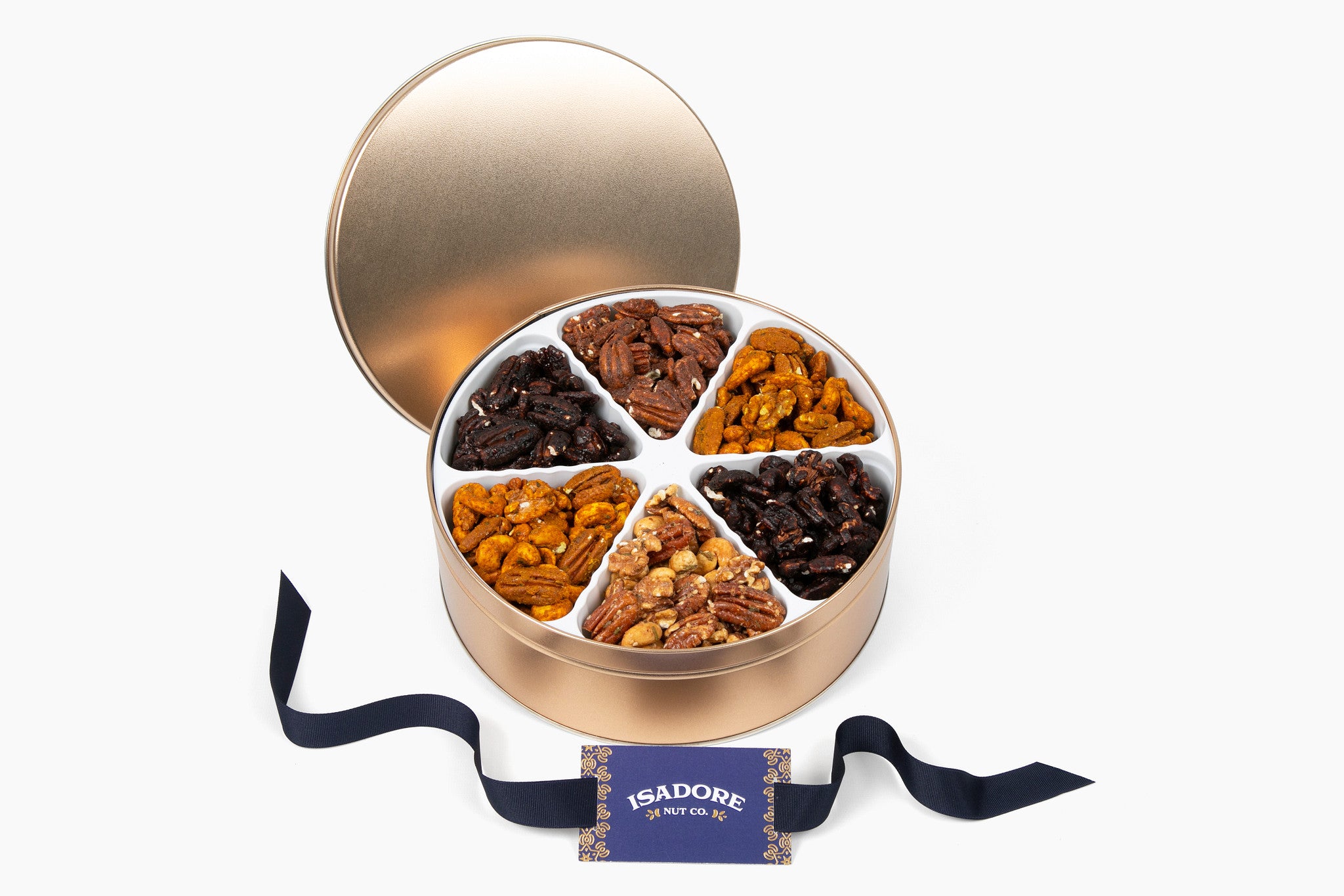 Three pounds of the six most delicious nut mixes in the country, packaged in an elegant gold tin and wrapped with our signature navy grosgrain ribbon and Isadore gift tag.