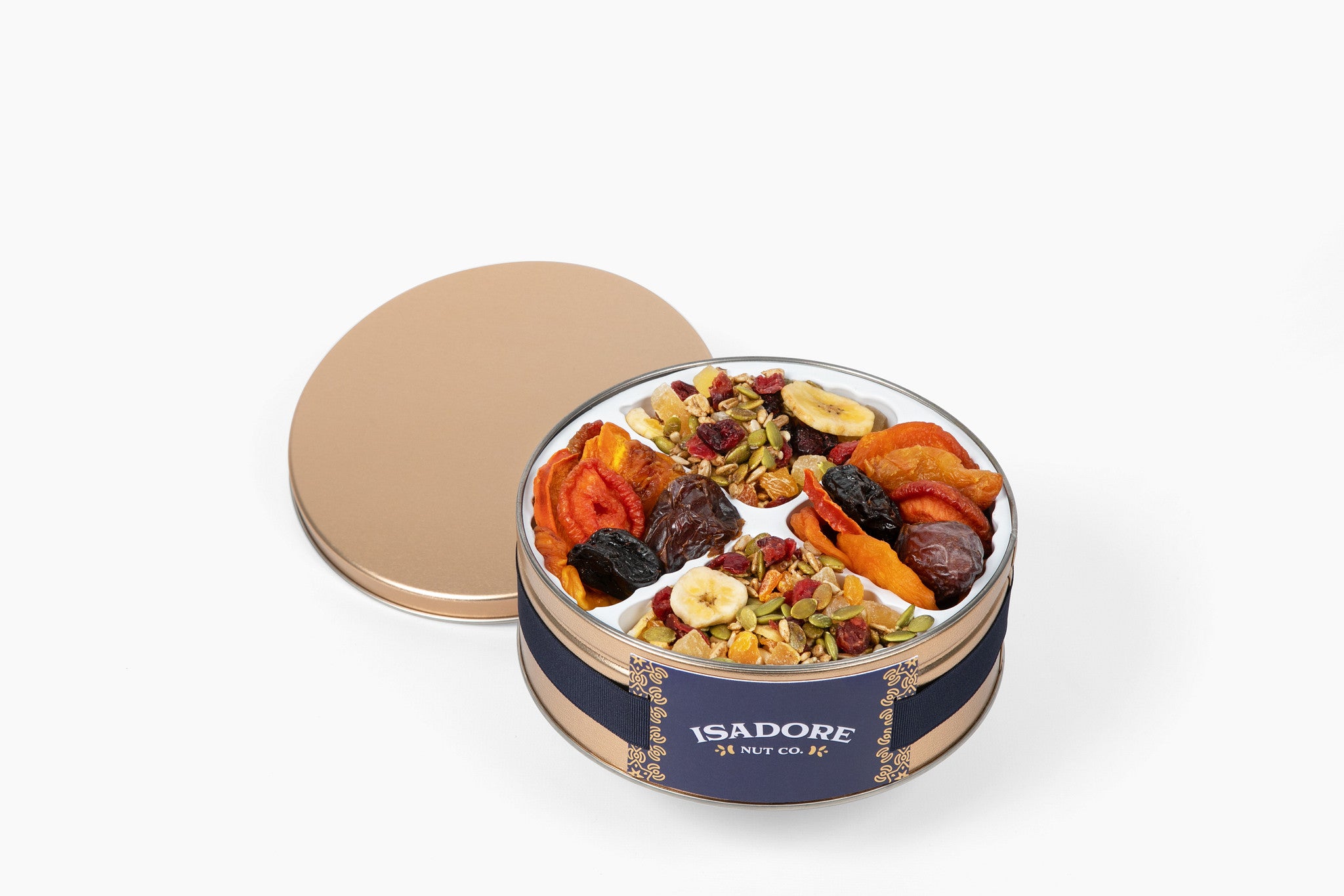 A gold gift tin overflows with a premium selection of whole assorted sun dried fruits that may include large medjool dates, nectarines, pears, peaches, prunes, persimmons, pineapple, and pluots.